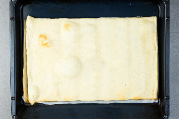 Inzwischen den Teig mit dem Papier nach unten auf einem Backblech ausrollen und mehrmals mit einer Gabel einstechen. Den Teig im Ofen 5–7Min. vorbacken, bis er stellenweise leicht gebräunt ist, dann aus dem Ofen nehmen.