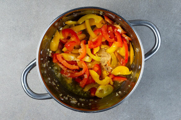 Die Paprika vom Herd nehmen und etwas abkühlen lassen. Wenn Kinder mitessen, eine Portion Paprika mit einer Schaumkelle abnehmen und beiseitestellen, die restliche Paprika nach Geschmack mit den Chiliflocken würzen, dann ebenfalls mit einer Schaumkelle aus dem Topf nehmen. Die Pizza aus dem Ofen holen, in Stücke schneiden und mit dem Paprikarelish garniert servieren.