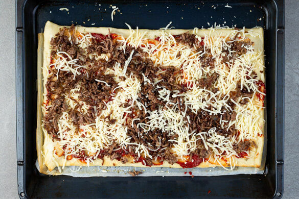 Fleischliebhaber kommen heute voll auf ihre Kosten! Wir toppen unsere Pizza nämlich mit aromatisch gebratenem Rinderhack, das mit zart schmelzendem Käse eine unwiderstehliche Liaison eingeht. Für den besonderen Kick garnieren wir unser Werk mit einem pikanten Paprikarelish. Wer es feuriger mag, kann mit Chiliflocken den Schärfegrad nach oben drehen. Da läuft uns doch jetzt schon das Wasser im Munde zusammen!