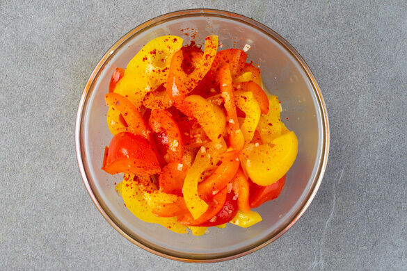 Den Backofen auf 200°C (180°C Umluft) vorheizen. Den Knoblauch schälen und grob würfeln. Die Zwiebel schälen, halbieren und fein würfeln. Die Paprika vierteln, entkernen und quer in dünne Streifen schneiden.
