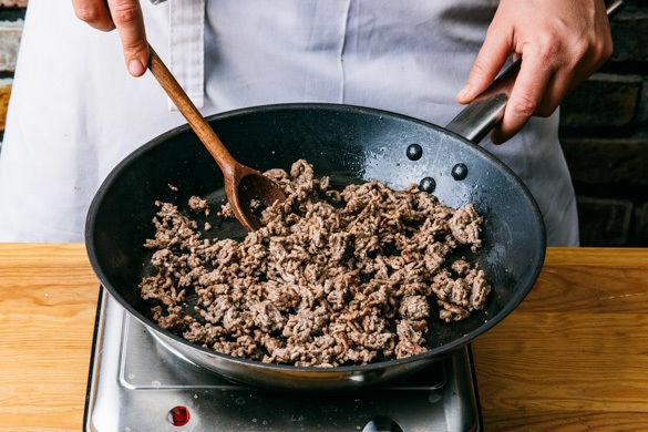 Das Hackfleisch in einer großen Pfanne mit 2EL Olivenöl bei mittlerer Hitze ca. 3–4Min. krümelig anbraten.