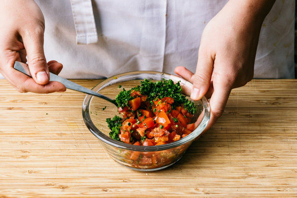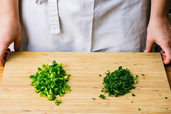 Die Paprika vierteln, entkernen und in ca. 0,5cm kleine Würfel schneiden. Die Petersilie samt Stängeln fein hacken.
