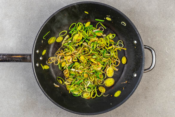 Den Lauch in der Pfanne mit 1 kräftigen Prise Salz bei mittlerer Hitze ca. 3Min. braten, bis der Lauch weich wird, dabei nur nach Bedarf etwas Öl hinzufügen. Wer den Lauch weicher mag, kann ihn etwas länger braten. Anschließend mit der restlichen Gewürzmischung sowie ggf. mehr Salz abschmecken.