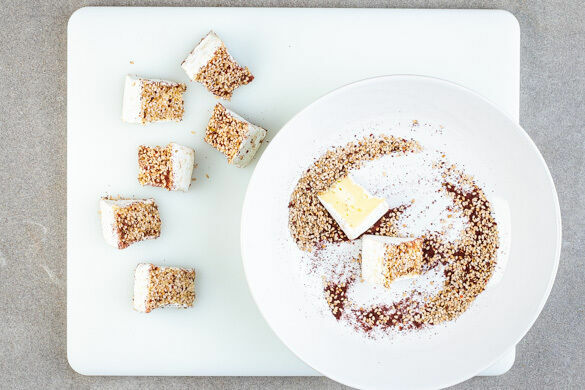 Die Za’atar-Gewürzmischung auf einem flachen Teller verteilen und die Schnittseiten des Bries leicht hineindrücken, bis sie gleichmäßig bedeckt sind.