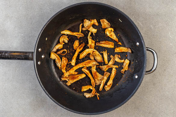 Die Pilze in 1–2cm breite Streifen zupfen oder schneiden, dann in einer mittelgroßen Pfanne mit 1EL Olivenöl bei mittlerer Hitze in 6–8min. goldbraun und knusprig braten. Mit der ½ der italienischen Gewürzmischung und 1 kräftigen Prise Salz würzen und auf einem Teller beiseitestellen. Die Pfanne wird weiterverwendet.