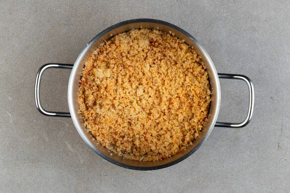 1TL Gewürzmischung, dann den Couscous in das kochende Wasser rühren. Den Topf vom Herd nehmen und den Couscous 6–8Min. abgedeckt quellen lassen.