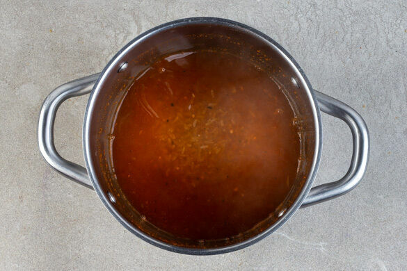 Mit 250ml Wasser ablöschen und die Mole 6–8Min. bei mittlerer Hitze einköcheln lassen. Mit einem Stabmixer im Topf sämig pürieren und die Mole ggf. mit etwas Wasser verdünnen, falls sie zu dickflüssig ist. Nach Geschmack mit etwas mehr Zimt, Kakao und Brühgewürz verfeinern und die Mole noch 2–3Min. unter Rühren köcheln lassen. Abgedeckt beiseitestellen.