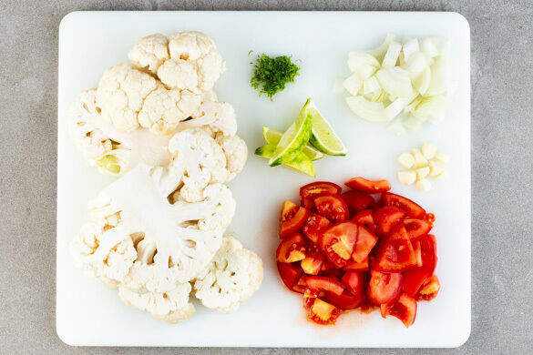 Den Backofen auf 220°C (200°C Umluft) vorheizen. Den Blumenkohl vom Strunk befreien und in ca. 1cm dicke Scheiben schneiden. Die Tomaten grob würfeln, dabei den Strunk entfernen. Die Zwiebel und den Knoblauch schälen und grob würfeln. Die Limettenschale abreiben und die Limette in Spalten schneiden.
