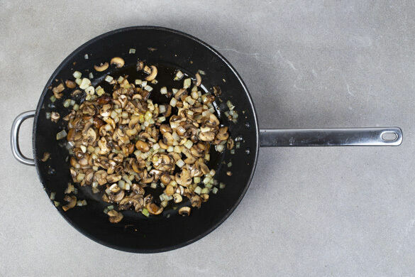 Die Zwiebeln in einer großen Pfanne mit 1EL Pflanzenöl bei mittlerer Hitze 2–3Min. anschwitzen. Den Knoblauch ca. 30Sek. mitbraten, dann die Pilze zugeben und ca. 5Min. braun anbraten. Mit je 1 Prise Salz und Pfeffer würzen.