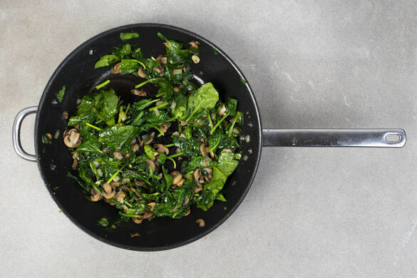 Den Spinat zu den Pilzen in die Pfanne geben und abgedeckt bei mittlerer Hitze ca. 1Min. garen, bis er zusammenfällt.