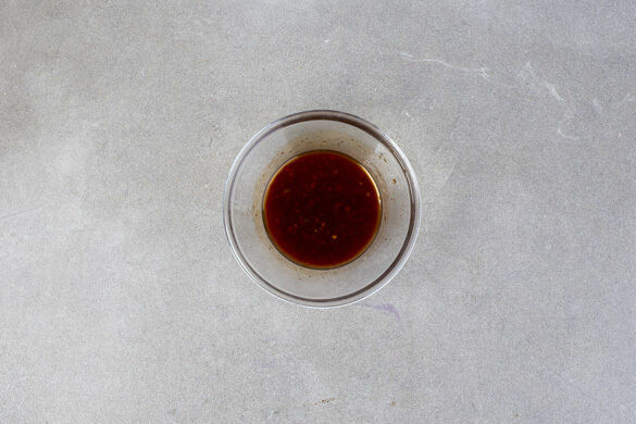 Die Sojasauce mit der Sweet-Chili-Sauce, dem Sesamöl, ca. ⅓ des Sambal Badjaks oder mehr nach Geschmack, 2–3EL Limettensaft und 1–2TL Limettenschale verrühren.