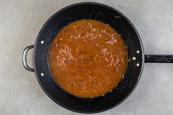 Die Zwiebeln in einer großen Pfanne mit 2EL Olivenöl, 2TL Zucker und 1TL Salz bei starker Hitze 5–6Min. kräftig anbräunen. 2TL Mehl unterrühren, mit 500ml Wasser ablöschen und die Sauce bei mittlerer Hitze 3–4Min. einköcheln lassen. Tipp: Wer mag, kann für noch mehr Geschmack 200ml Rotwein und 300ml Wasser verwenden.