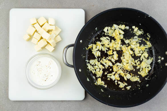 Die Zwiebeln und den Ingwer in einer großen Pfanne mit 1EL Butter bei mittlerer Hitze ca. 3Min. anbraten. Den Paneer-Käse in 1–2cm große Würfel schneiden. Den Joghurt mit Salz und Pfeffer abschmecken.