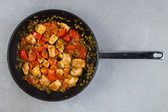 Die Tomate grob würfeln, zum Fleisch und Lauch in die Pfanne geben und alles abgedeckt 7–9Min. köcheln lassen, bis das Fleisch gar ist. Mit Salz und Pfeffer abschmecken.