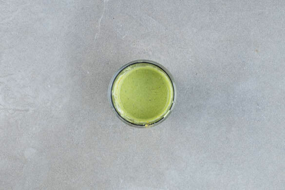 Die Paprika-Chili-Mischung mit der Crème fraîche in einem hohen Gefäß mit einem Stabmixer glatt und leicht dünnflüssig pürieren. Den Käse untermengen und die Paprikacreme mit Salz und Pfeffer abschmecken.