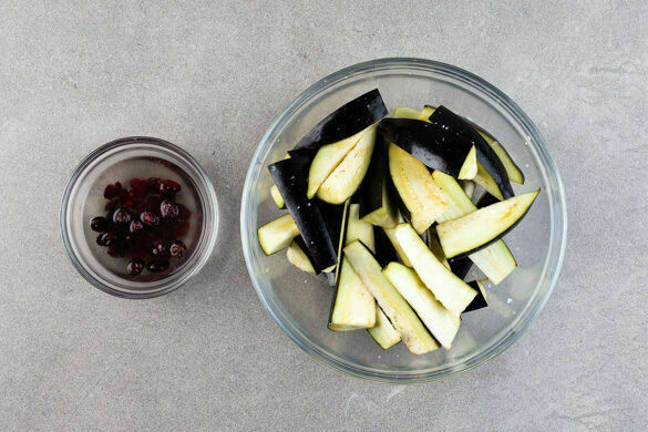 Den Backofen auf 240°C (220°C Umluft) vorheizen. In einem mittelgroßen Topf 600ml leicht gesalzenes Wasser zum Kochen bringen. Die Auberginen längs in Streifen schneiden, dann quer halbieren, mit 1EL Salz vermengen und beiseitestellen. Tipp: Das Salz macht die Auberginen weicher und weniger bitter, es wird später abgespült. Die Cranberrys in heißem Wasser einweichen.