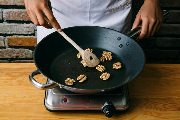 Die 1/2 der Walnüsse in einer großen Pfanne ohne Zugabe von Fett bei mittlerer Hitze 1–2Min. goldbraun anrösten, dabei regelmäßig rühren, damit die Nüsse nicht anbrennen. Auf einem Teller beiseitestellen. Tipp: Die übrigen Walnüsse beim nächsten Nachmittagstief snacken.
