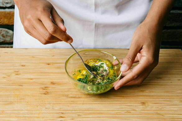 Die Estragonblätter von den Stängeln zupfen und die 1/2 der Blätter grob schneiden. Die Zitronenschale fein abreiben, dann die Zitrone halbieren und auspressen.