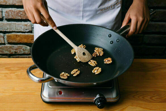 Die Walnüsse in einer großen Pfanne ohne Zugabe von Fett bei mittlerer Hitze 1–2Min. goldbraun anrösten, dabei regelmäßig rühren, damit die Nüsse nicht anbrennen. Auf einem Teller beiseitestellen.