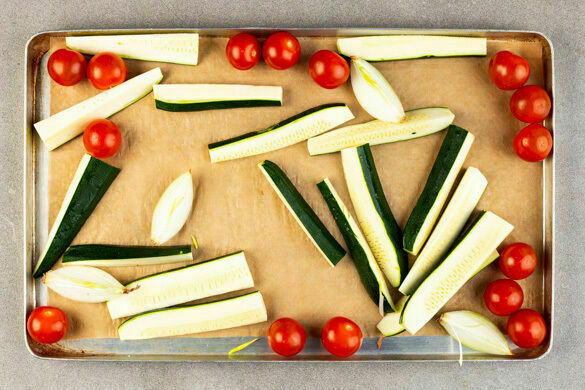 Die Schalotten schälen und vierteln. Die Zucchini längs halbieren und in ca. 1cm breite Spalten schneiden. Mit den Kirschtomaten auf einem zweiten mit Backpapier ausgelegten Backblech verteilen.