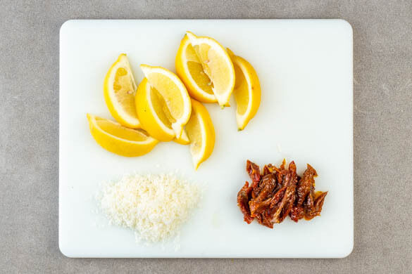 Die Zitrone in Spalten schneiden. Die getrockneten Tomaten in feine Streifen schneiden. Den Käse fein reiben.