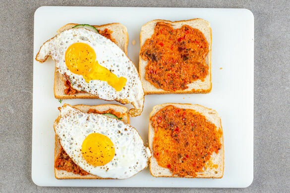 Wir finden: Dieses Gericht hat fast schon ein bisschen Diner-Charakter und versetzt uns in Gedanken auf rote Polsterbänke mit Jukebox-Musik im Hintergrund. Wir servieren nämlich ein knuspriges Spiegelei-Sandwich mit leckeren Ofenkartoffeln als Beilage. In alter Marley-Spoon-Manier gibt’s ein bisschen Raffinesse dazu – in Form von frischem Gurken-Dill-Salat und einem Aufstrich aus gerösteter Paprika und getrockneten Tomaten.