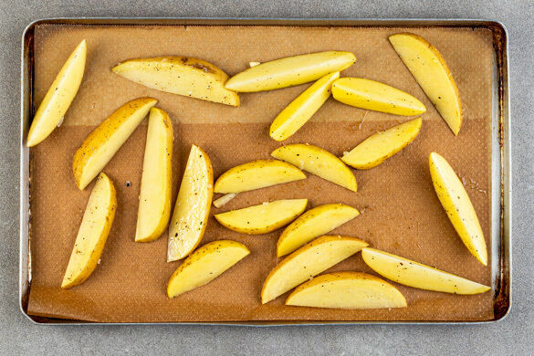 Den Backofen auf 240°C (220°C Umluft) vorheizen. Die Kartoffeln samt Schale in ca. 2cm breite Spalten schneiden und auf einem mit Backpapier ausgelegten Backblech mit der Gewürzmischung, 1EL Pflanzenöl sowie je 1 Prise Salz und Pfeffer vermengen und gleichmäßig verteilen. Im Ofen 20–25Min. backen, bis die Kartoffeln goldbraun und knusprig sind, dabei einmal wenden.