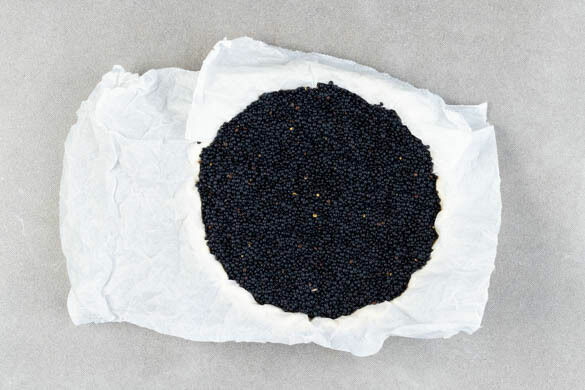Mit einer Gabel Löcher in den Boden und die Seiten des Teiges stechen. Das Backpapier über den Teig legen. Ggf. mehr Backpapier verwenden, sodass der gesamte Teig bedeckt ist. Die Quicheform mit dem Backgewicht befüllen. Tipp: Die Ränder mit dem Backgewicht stabilisieren, damit sie beim Backen nicht zusammenfallen.