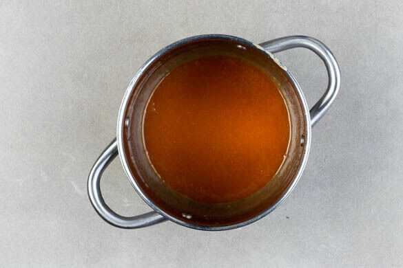 Den Topf vom Herd nehmen, sobald der Karamell goldbraun wird. Mit 130ml Sahne ablöschen und vorsichtig verrühren. Den erhärteten Karamell bei mittlerer Hitze erwärmen, bis er flüssig wird und Blasen schlägt, dann wieder vom Herd nehmen und 30g Butter einrühren. Zum Auskühlen beiseitestellen.