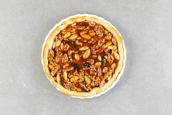 Die Tarte im Ofen 12–14Min. backen, bis die Ränder leicht bräunen. Aus dem Ofen nehmen und das Backpapier samt Backgewicht entfernen. Die Tarte 2–5Min. weiterbacken, bis der Teig am Boden trocken ist. Die Nüsse und die Kürbiskerne darauf verteilen, mit dem Karamell übergießen und die Tarte in 8–11Min. goldbraun backen. Auskühlen lassen und mit dem Joghurt servieren.