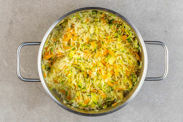 Den Reis im Sieb unter fließendem Wasser abspülen, bis das Wasser klar bleibt. Zum Gemüse in den Topf geben und ca. 1Min. mitrösten. Dann die ½ des Brühgewürzes hinzufügen und mit 300ml heißem Wasser ablöschen. Den Pilaw abgedeckt bei niedriger Hitze 14–17Min. garen und noch ca. 5Min. ohne Hitzezufuhr nachziehen lassen.