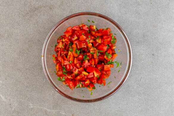 Die Tomaten in kleine Würfel schneiden. Die Petersilie samt Stängeln fein hacken und mit den Tomaten, 1EL Olivenöl sowie je 1 Prise Salz und Pfeffer vermengen. Den Dill fein schneiden und unter den Pilaw mischen. Den Pilaw mit Salz und Pfeffer abschmecken und mit dem gebackenen Feta und der Salsa anrichten und servieren.