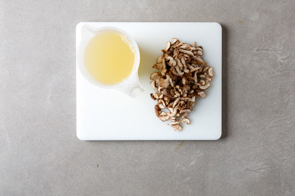 800ml Wasser im Wasserkocher aufkochen und den Brühwürfel darin auflösen. Die Pilze mit einer Bürste oder etwas Küchenkrepp ggfs. von Dreck befreien und in feine Scheiben schneiden.
