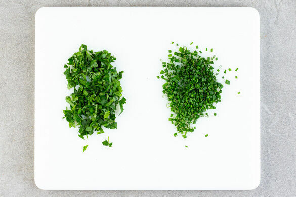 Die Petersilienblätter abzupfen und grob hacken. Den Schnittlauch in kleine Röllchen schneiden.