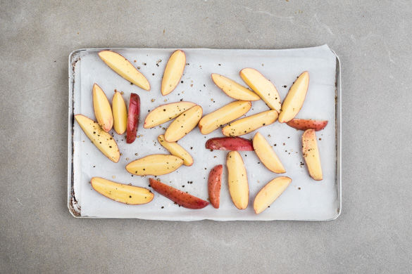 Den Backofen auf 180°C Umluft (200°C Ober-/Unterhitze) vorheizen. Die Kartoffeln je nach Größe halbieren oder vierteln und auf einem mit Backpapier ausgelegten Backblech verteilen. Mit 1–2EL Olivenöl, Salz und Pfeffer mischen und ca. 20–25Min. im Ofen backen.