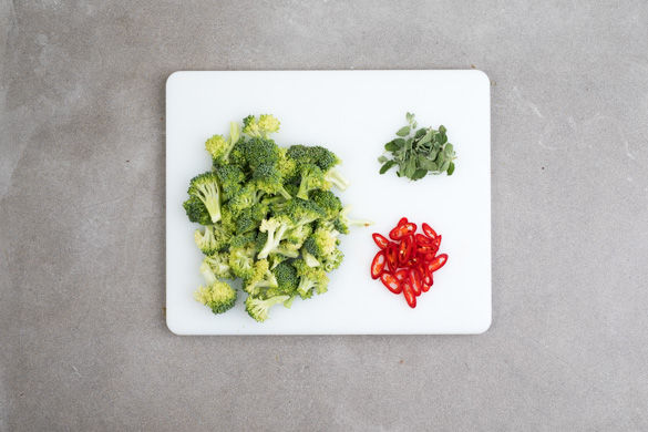 In einem mittelgroßen Topf ausreichend leicht gesalzenes Wasser zum Kochen bringen. Die Brokkoliröschen samt Stielen in ca. 2–3cm große Stücke schneiden, im kochenden Wasser 2–3Min. blanchieren, dann in ein Sieb abgießen. Die Oreganoblätter von den Stängeln streifen. Die Chili halbieren, ggf. entkernen und in feine Streifen scheiden. Alles beiseitestellen.