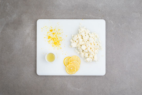 Die Zitronenschale abreiben, dann die Zitrone halbieren, eine Hälfte auspressen, die zweite Hälfte in feine Scheiben schneiden. Den Hirtenkäse mit einer Gabel oder den Fingern grob zerkrümeln.