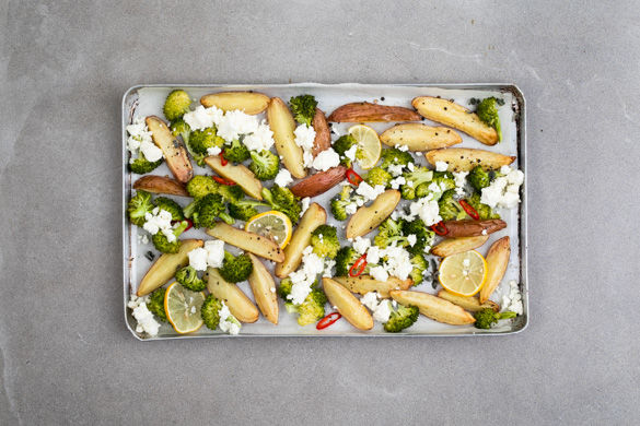 Das Blech aus dem Ofen nehmen und den Brokkoli, den Oregano, die Chili und die Zitronenscheiben auf dem Blech mit den Kartoffeln mischen, dabei ggf. noch 1EL Olivenöl zugeben. Weitere ca. 8–10Min. im Ofen backen, bis der Brokkoli kross ist und die Kartoffeln gar sind. Die letzten ca. 2–3Min. den Hirtenkäse über dem Gemüse verteilen und mitbacken.