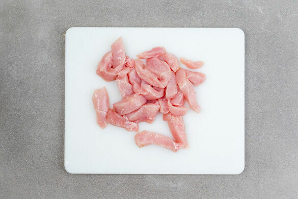 Das Fleisch trocken tupfen und in 3–4cm lange Steifen schneiden.