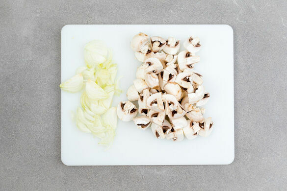 In einem großen Topf ausreichend gesalzenes Wasser für die Pasta zum Kochen bringen. Die Pilze ggf. säubern und je nach Größe vierteln oder sechsteln. Die Zwiebeln schälen, halbieren und in feine Streifen schneiden.