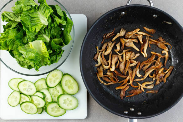 Die Pilze und die restlichen Hefeflocken mit 1EL Pflanzenöl und einer kräftigen Prise Salz in einer großen Pfanne bei mittlerer bis starker Hitze 5–7Min. anbraten, bis die Pilze weich und appetitlich gebräunt sind. Inzwischen die Gurke in dünne Scheiben schneiden. Den Romanasalat in mundgerechte Stücke zupfen.