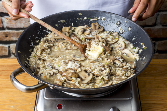 Den Reis und das Steinpilzpulver zum Gemüse in die Pfanne geben und ca. 1Min. mitrösten, dann nach und nach mit der Brühe ablöschen und stetig rühren, damit der Reis nicht ansetzt. Diesen Vorgang 18–20Min. lang wiederholen, bis die Brühe aufgebraucht und der Reis bissfest ist. Evtl. etwas mehr Wasser zugeben.