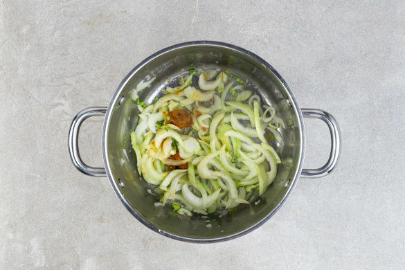 Den restlichen Knoblauch, den restlichen Ingwer sowie die weißen Pak-Choi-Streifen und Lauchzwiebeln in dem Topf mit 2EL Pflanzenöl bei mittlerer Hitze ca. 1Min. anbraten. Die ½ der Currypaste hinzugeben und ca. 1Min. unter Rühren mitbraten.