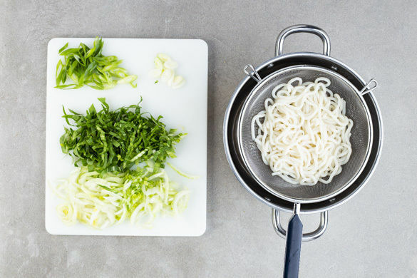 Die Nudeln ins kochende Wasser geben und in 2–3Min. bissfest kochen, zwischendurch umrühren, um die Nudeln voneinander zu trennen. In ein Sieb abgießen und abgedeckt beiseitestellen. Den Pak Choi in feine Streifen schneiden, den grünen vom weißen Teil trennen. Die Lauchzwiebel schräg in dünne Ringe schneiden und ebenfalls den grünen und weißen Teil trennen.