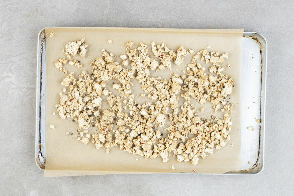 Den Tofu trocken tupfen und mit den Fingern zerbröseln. 2EL Pflanzenöl mit ca. ⅓ des Ingwers, ⅓ des Knoblauchs, der ½ der Chilischote, ⅓ des Sesams und der ½ der Sojasauce gut verrühren und mit dem Tofu vermengen. Den Tofu auf einem mit Backpapier ausgelegten Backblech verteilen, mit Salz und Pfeffer würzen und im Ofen ca. 15Min. knusprig rösten.