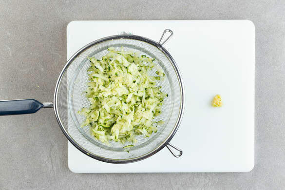 In einem mittelgroßen Topf ausreichend gesalzenes Wasser für die Pasta zum Kochen bringen. Die Zucchini mit einer Küchenreibe grob raspeln und in ein Sieb geben, dann mit den Händen so viel Flüssigkeit wie möglich herausdrücken. Den Knoblauch schälen und fein reiben.