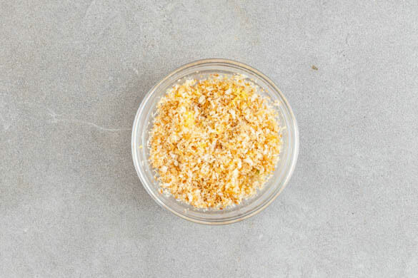 Die ½ des Panko-Paniermehls in einer mittelgroßen Pfanne mit 1TL Olivenöl bei mittlerer bis starker Hitze 2–4Min. anbraten, bis es goldbraun ist. Inzwischen die Zitronenschale abreiben, dann die Zitrone halbieren und auspressen. Das Panko-Paniermehl aus der Pfanne nehmen, mit der Zitronenschale vermengen und mit 1 Prise Salz würzen. Die Pfanne auswischen.
