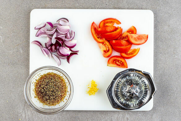 Inzwischen die Zwiebel schälen, halbieren und in schmale Spalten schneiden. Die Tomate ebenfalls in schmale Spalten schneiden. Die Zitronenschale abreiben, dann die Zitrone halbieren und auspressen. Die ½ des Zitronensafts mit der Sojasauce, 1TL getrocknetem Oregano und 1 kräftigen Prise Pfeffer zu einer Würzsauce verrühren.