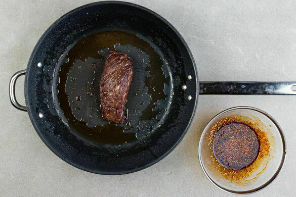 Die Teriyakisauce mit der restlichen Sojasauce, 2EL hellem Essig und 2TL Mehl verrühren, dann den Sesam unterrühren. Das Fleisch mit etwas Küchenkrepp trocken tupfen, von beiden Seiten mit Salz und Pfeffer würzen und in der Pfanne mit 2EL Pflanzenöl bei starker Hitze auf jeder Seite ca. 1Min. scharf anbraten.