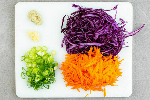 Den Rotkohl mit ½TL Salz 2–3Min. durchkneten, bis der Kohl weich wird. Dabei am besten Küchenhandschuhe tragen. Die Karotten, den Ingwer, 2EL Pflanzenöl und 4EL hellen Essig untermengen und den Salat mit 2–3EL Sojasauce, 1TL Zucker, ½TL Pfeffer sowie Salz nach Geschmack würzen.
